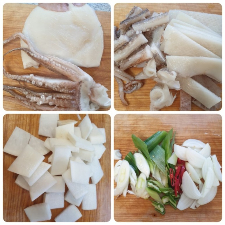 손질한 오징어는 몸통과 다리를 먹기 좋은 크기로 썰어 준비합니다. 너무 크게 자르면 익는 시간이 길어지고 질겨질 수 있으므로 적당한 크기로 써는 것이 좋습니다.
