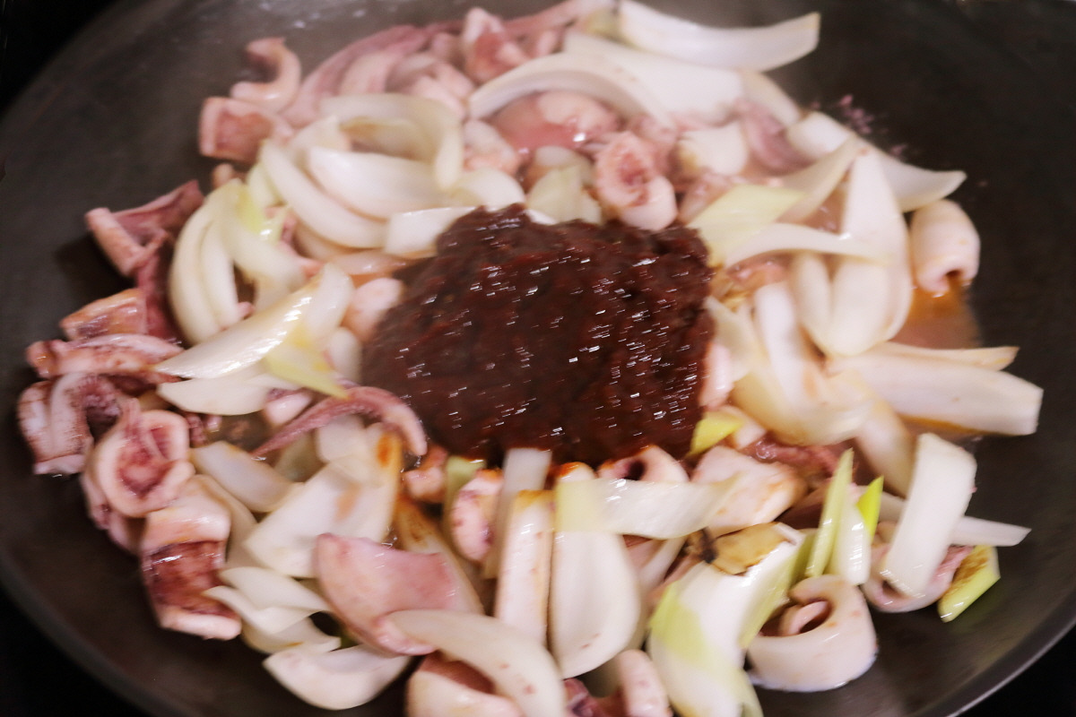 채소가 어느 정도 익으면 손질한 오징어를 넣고 빠르게 볶아주는 단계로 넘어갑니다. 이때부터는 조리 속도가 중요합니다.